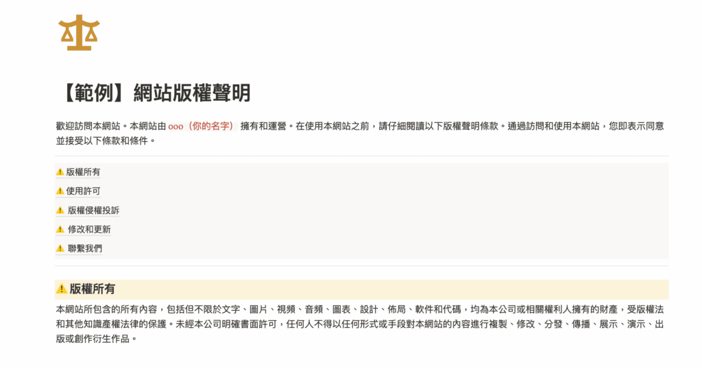 聲明的部分,可以包含:版權所有、使用許可、版權侵權投訴、修改和更新、聯繫我們等⋯