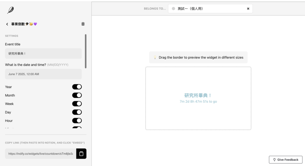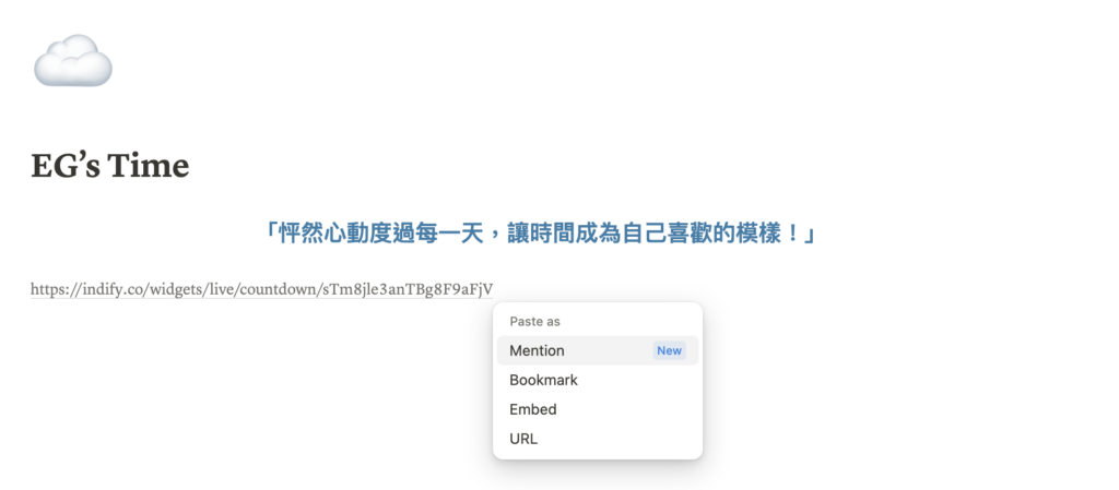 在 Notion 介面,選擇其中一個區塊(Block),貼上剛剛複製的連結。連結貼上後,選擇「Embed」(嵌入),等待一下,剛剛製作的倒數計時器就會顯示出來啦~