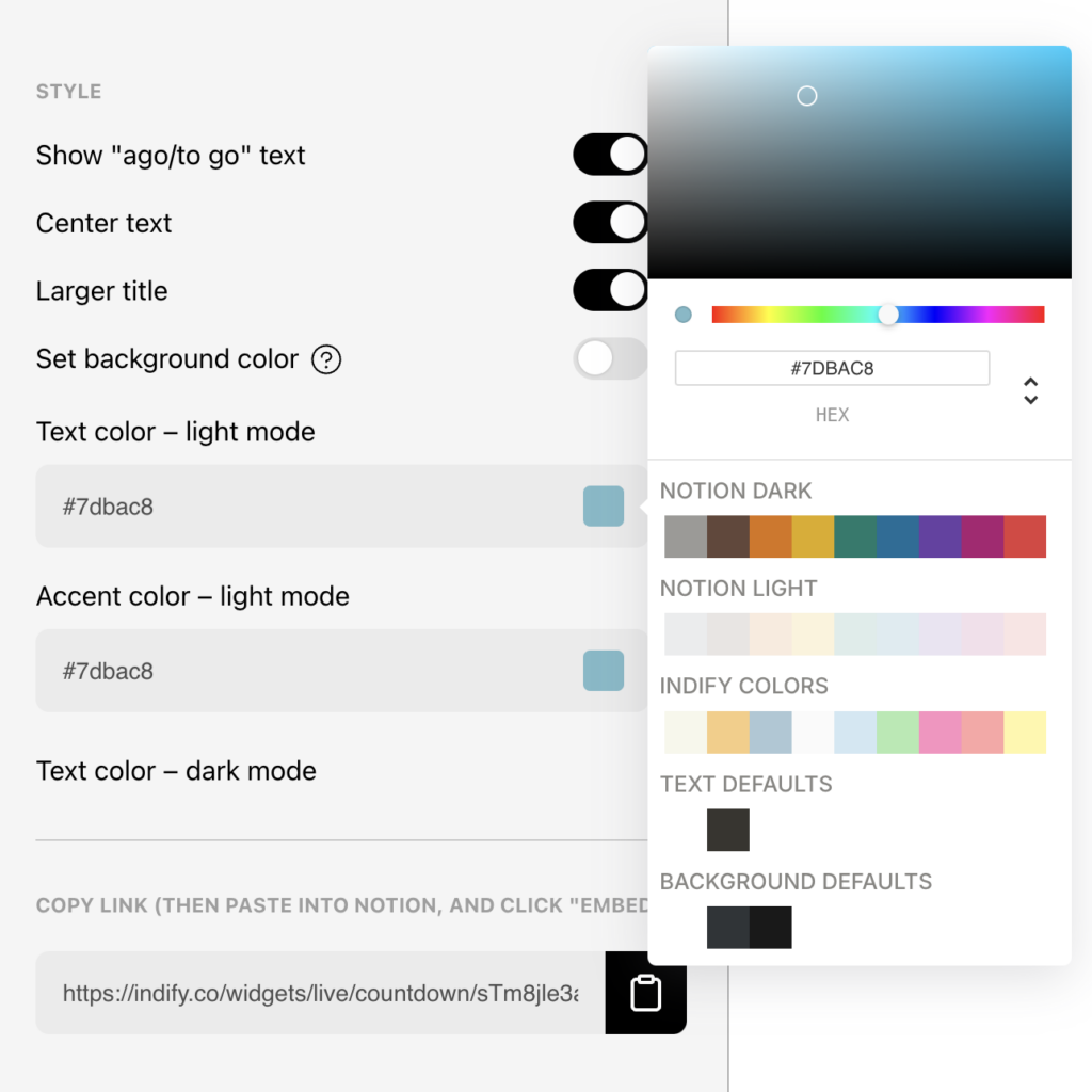 不得不說,indify 設計得非常貼心,考慮到 Notion 的日(light)/夜(dark)模式,在顏色的設定可以分兩個階段進行調整。