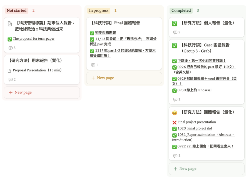 像是,我就將研究所的報告狀態分為「未開始」、「進行中」、「已完成」這 3 類。當完成報告時,只需將「進行中」的報告拖曳至「已完成」,就可以更新狀態,甚至一目了然掌握手邊所有報告的狀況!