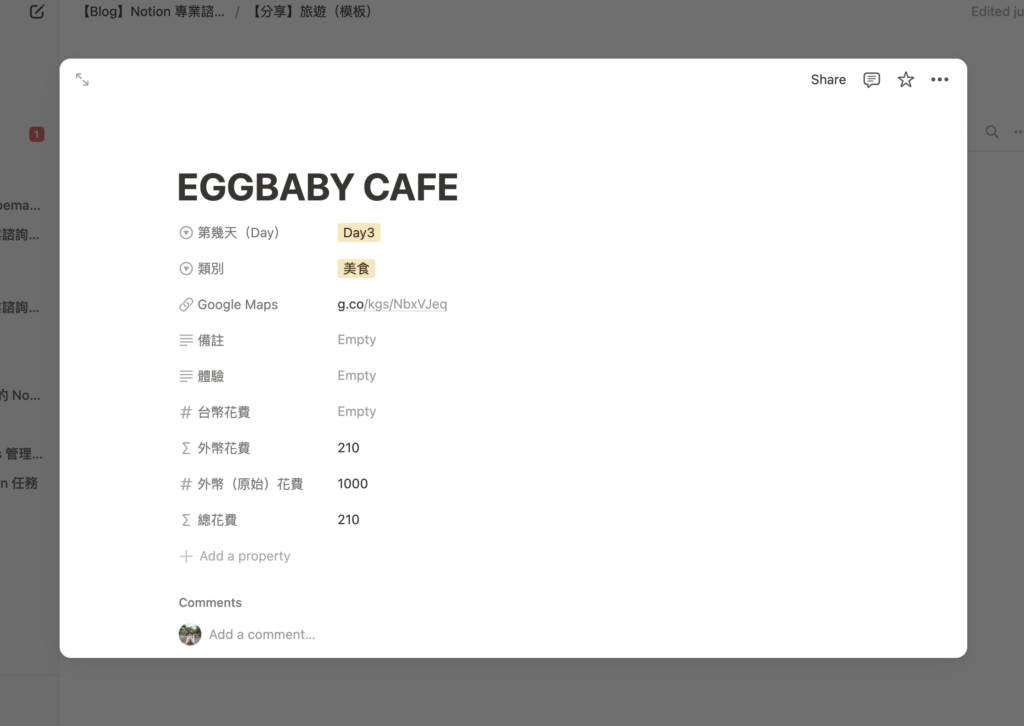 這是 Board 格式中非常重要的功能!由於旅遊行程通常以「天」為單位進行區隔,我會選擇「Select」的屬性欄位,來當作分組依據。以這個為例,我會選擇以「第幾天(Day)」作為分組依據,讓行程安排更加明確。