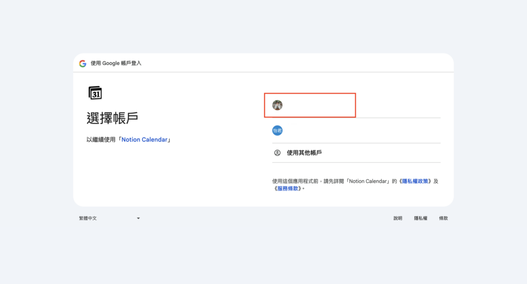 選擇與 Notion 帳號綁定的 Google Calendar,確保兩邊後續的資料能順利串接。