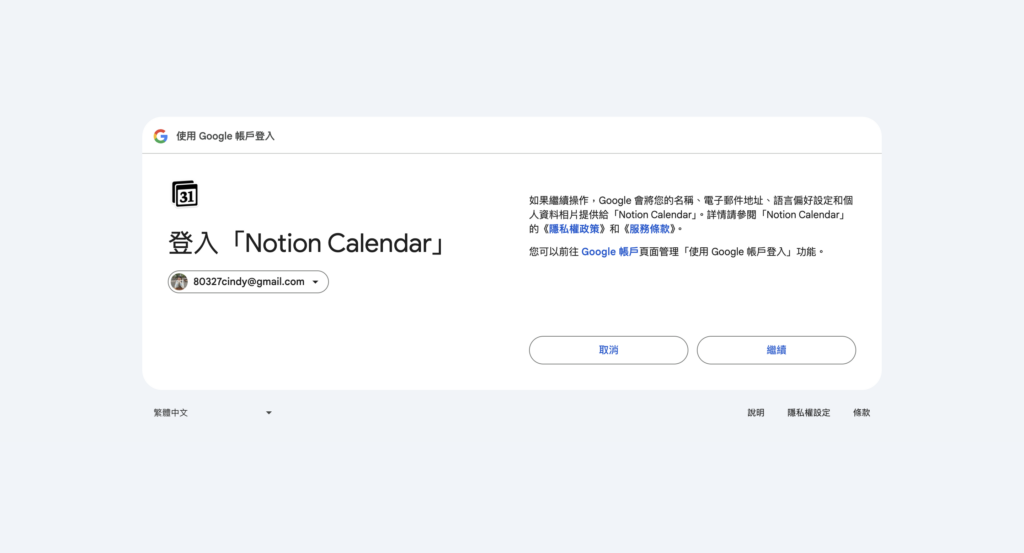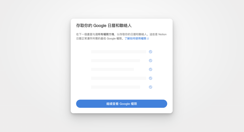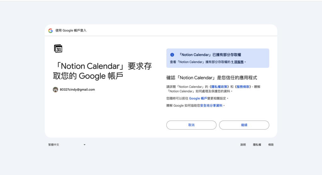 同意 Notion 日曆取得 Google 日曆的權限,直接點擊「同意」。