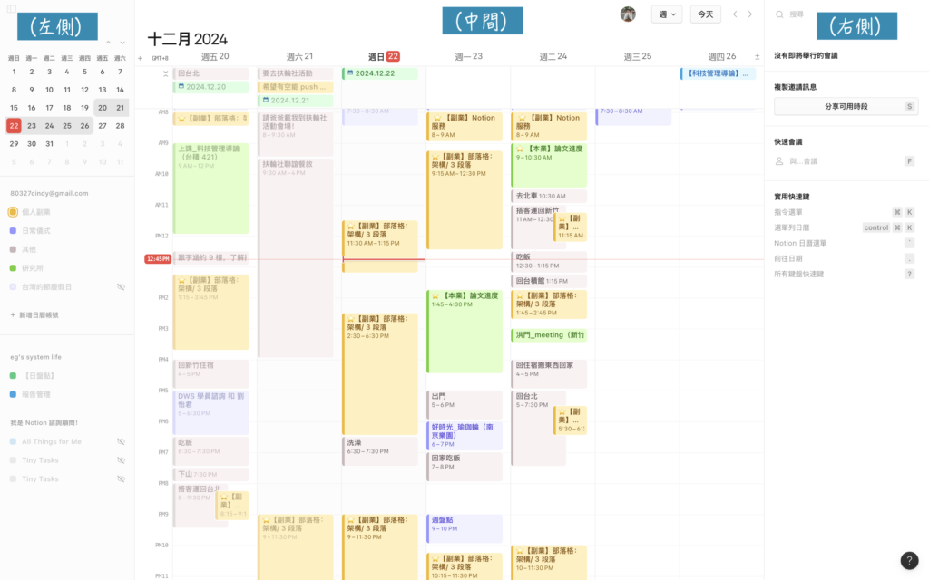 順利進入到 Notion 日曆後,可以看到設計直觀簡潔的頁面,主要分成左、中、右 3 大區塊!