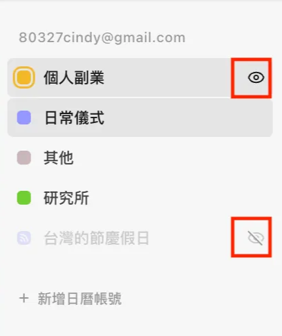 - 顯示與隱藏:當 Google Calendar 和 Notion 資料庫的資料同時顯示在 Notion 日曆上,可能會感覺資訊過多、過於雜亂。這時,可以透過點擊「眼睛」圖示,開啟或關閉特定內容,輕鬆篩選想查看的時程。