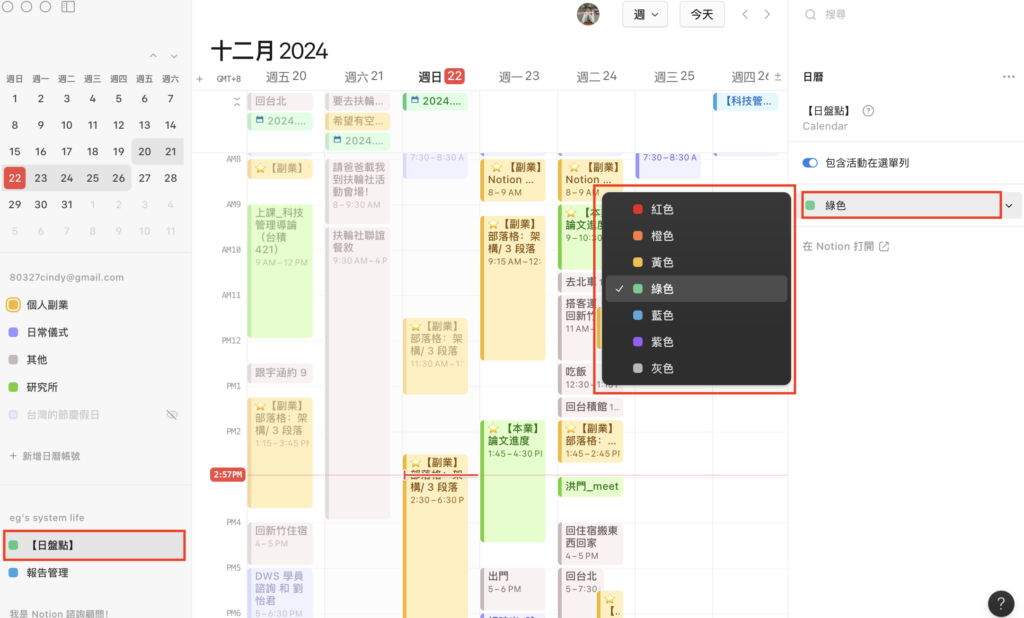 - 顏色與分類:點擊日曆分類細項即可更改顏色,方便區分不同類型的行程。Notion 日曆有提供 7 種不同的顏色(而屬於 Google Calendar 的項目,顏色則可自訂)。以我來說:在 Notion 日曆的「日盤點」標示綠色;「報告管理」則標記為藍色,一眼就能清楚辨別各項任務。