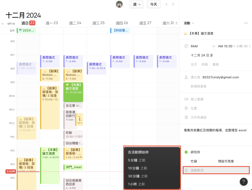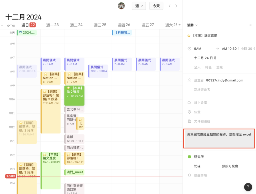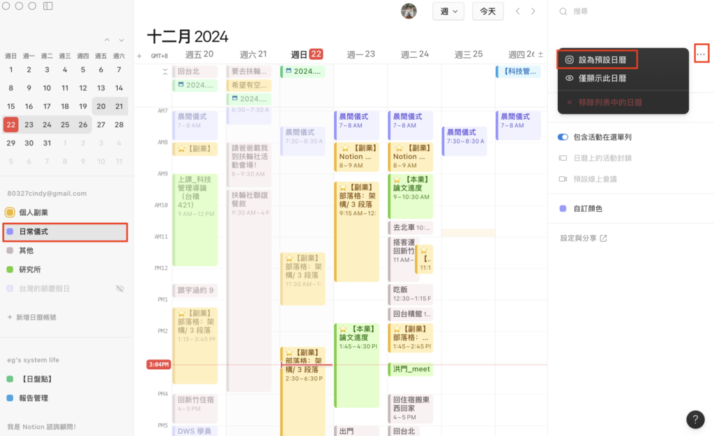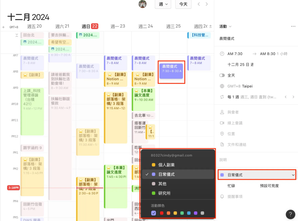- Google Calendar 的日曆會在這側出現!可以透過不同的日程需求,在日曆上做出區別。以我自己來說,將一天的日程分成 4 大面向,如日常生活、工作(研究所)、創作,以及其他。