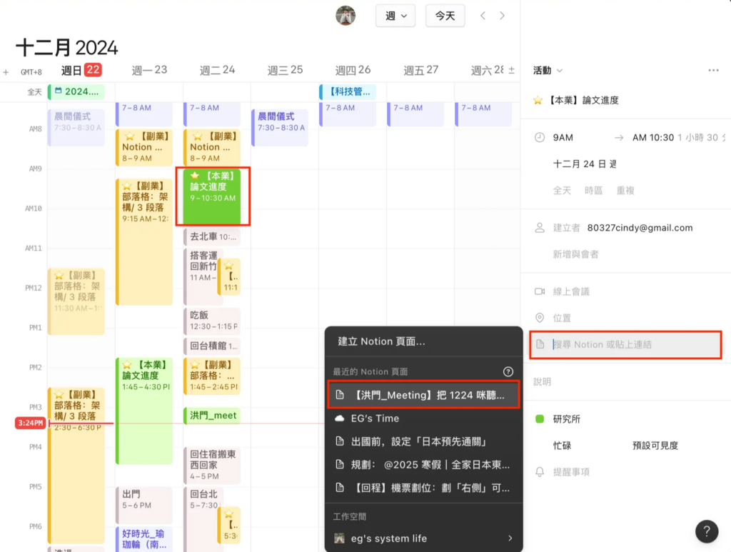 - 與 Notion 資料串接:點擊建立好的時間區塊,選擇「搜尋 Notion 或貼上連結」,即可將資料串連至指定頁面,快速跳轉,節省翻找資料的時間。