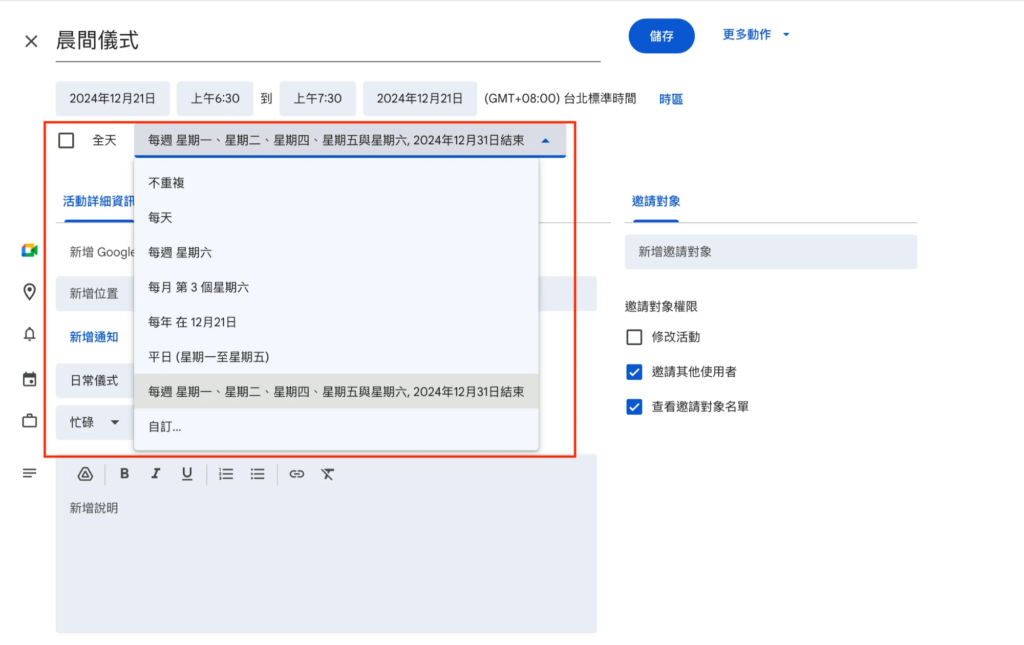 安排好時間後,因為 Notion 日曆已與 Google Calendar 串接,針對固定時間的日程,可以直接先在 Google Calendar 複製重複任務。