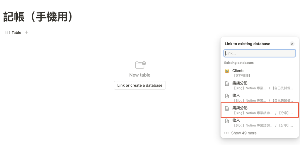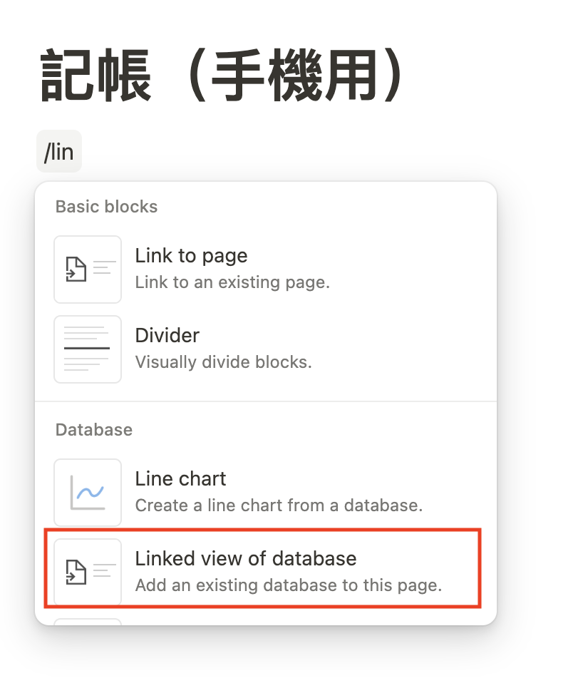 輸入快捷鍵 /lin,點選「Linked view of database」。