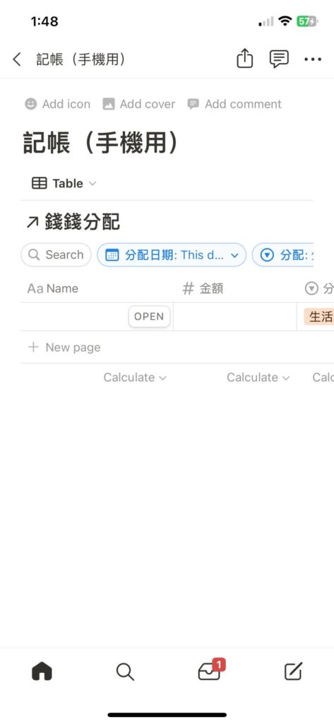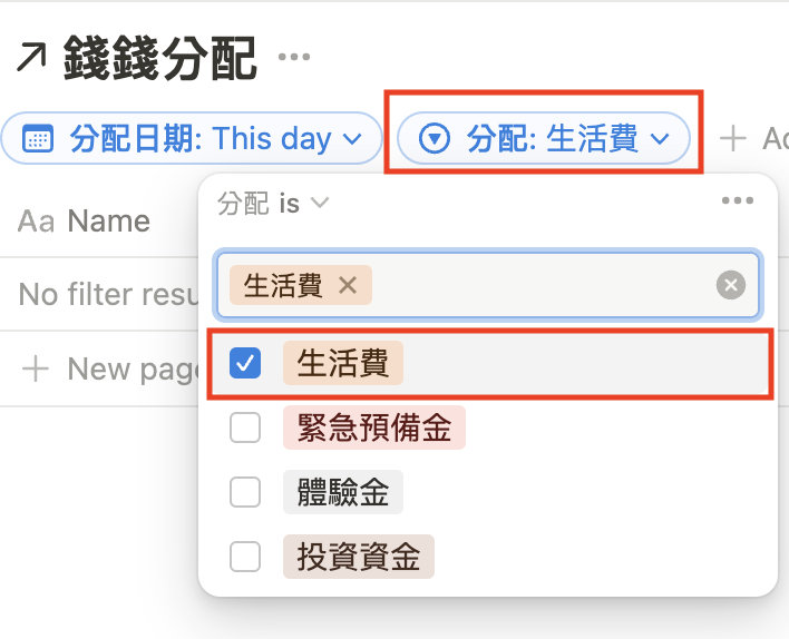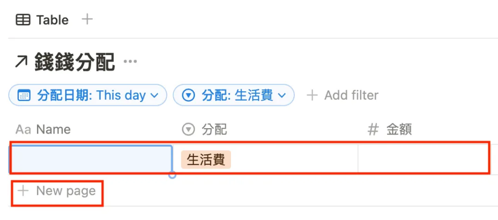 回到資料庫的頁面,按「+ New page」,就可以新增項目啦~因為前面有設定「生活費」的 filter。因此,會直接跳出,後續則不需要再設定一次!