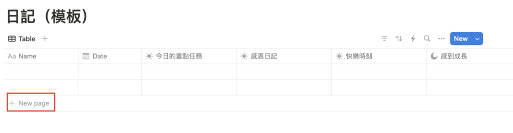 按下「+ New page」就可以新增日記篇數。