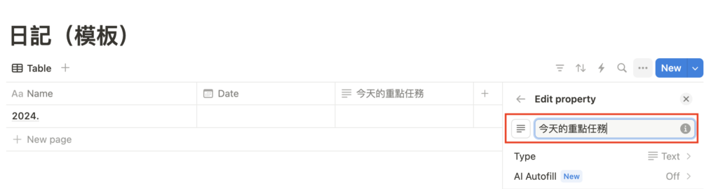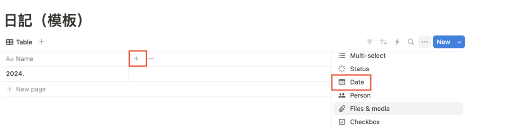 按「+」,新增日期(Date)屬性,來標示當天填日記的日期。