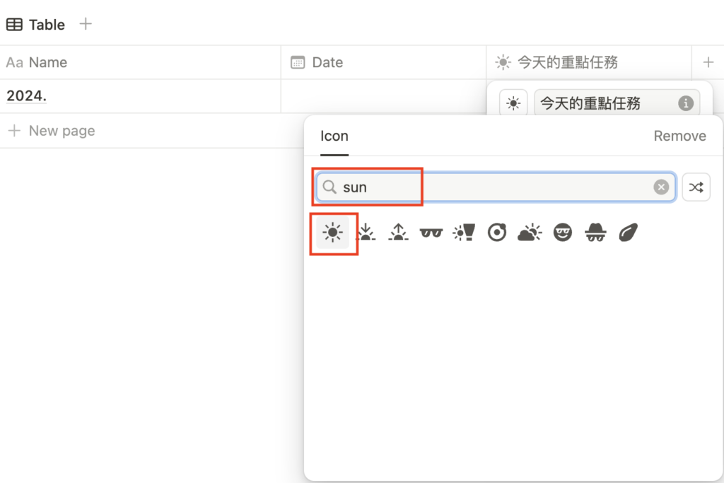 因為是晨間日記,所以將 icon 換成太陽。先在放大鏡旁打下 sun,並選擇自己喜歡的圖示!