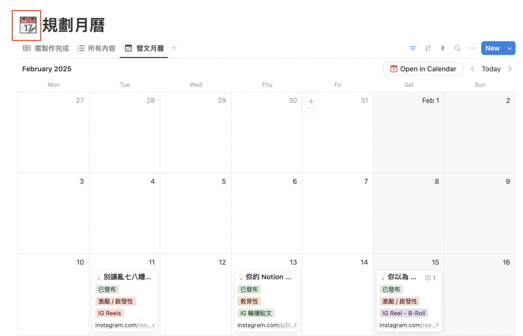 - 強化分類邏輯:Notion 不會只有一個類型的資料庫,可能包含日記、書籍、旅遊規劃等。因此,可將相關頁面設定對應的 icon ,像是 ✍🏻(日記)、📘(書籍)、🏝️(旅遊規劃)。這樣在不同資料庫之間跳轉時,只要看 icon 就能立刻辨識來源,快速找到需要的內容,減少搜尋時間。
