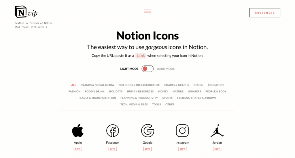 使用時,你可以點擊圖示本身或下方的紅色 Copy 鍵,複製連結後就可以直接在 Notion 當中替換 icon。