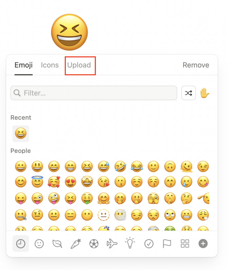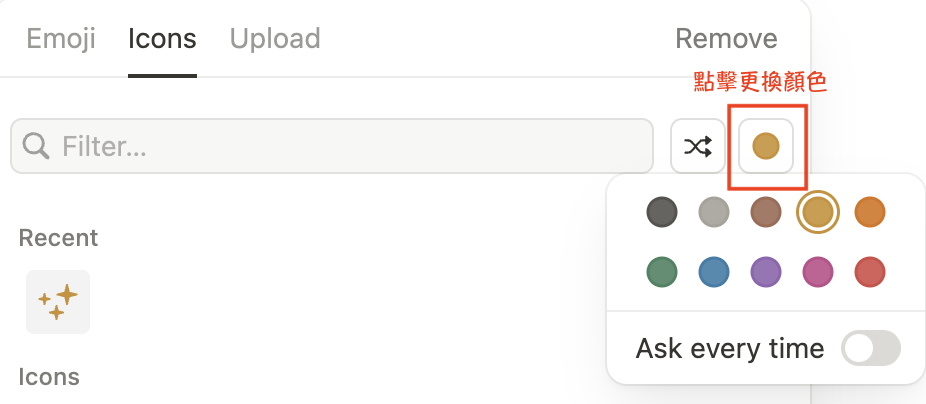 Notion 提供了多種 icon 選擇,除了內建選項,還能自行上傳,並且自訂 icon。