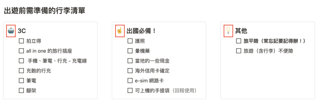 此外,像是下圖的行李清單,在「3C」、「出國必備」、「其他」不同的分類中,旁邊加上對應的 icon,就能一眼區分類別,讓內容更直覺易讀,而且畫面也更簡潔美觀!