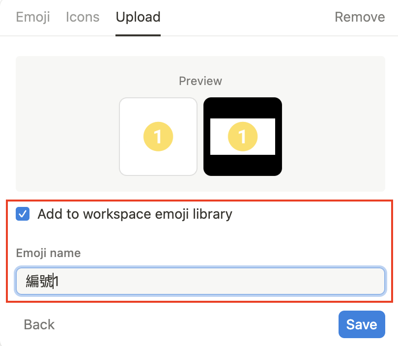 上傳完圖片之後,記得勾選「Add to workspace emoji library」,並且命名,這樣之後也會比較好辨識。