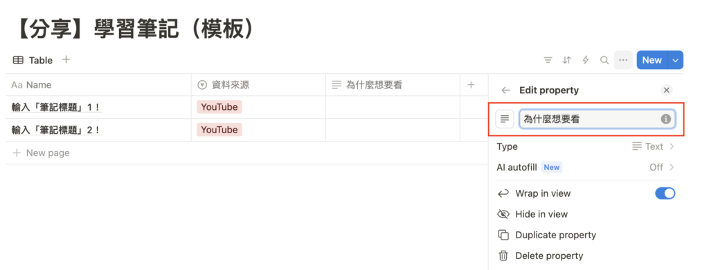上述提到筆記的 9 大屬性,現在我們就要來輸入至 Notion 的資料庫中。