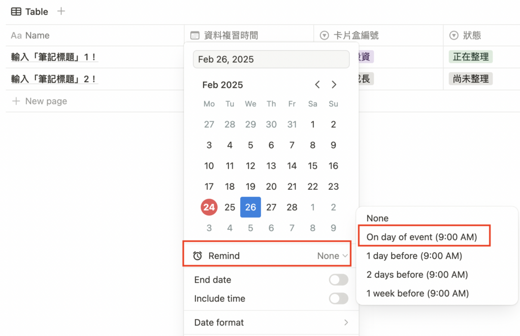 Notion 的提醒功能非常實用,無論是專案截止日、開始日提醒,還是筆記的複習時間,都能幫助你保持條理,不錯過任何重要事項!