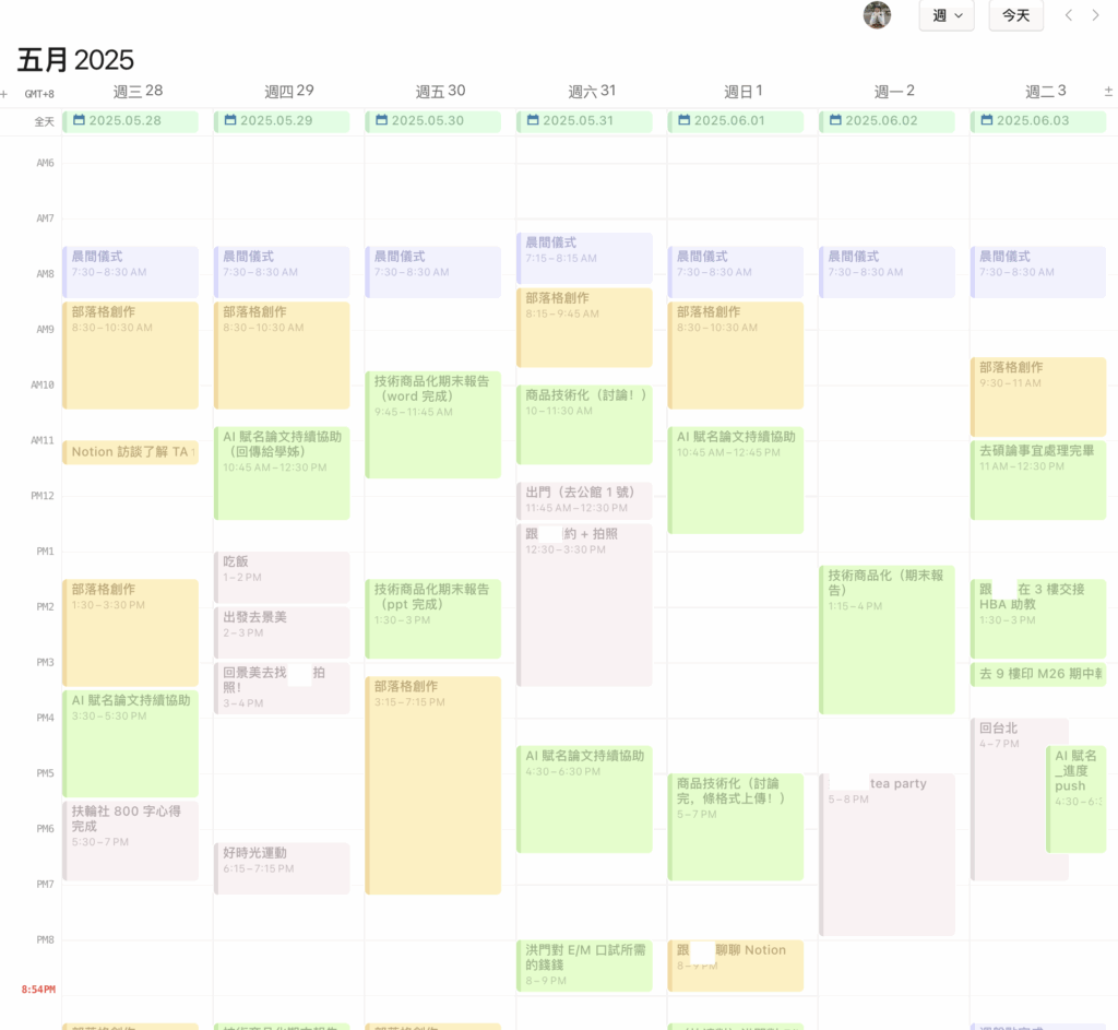自己習慣在每週一,以「時間區塊」的方式,在 Notion 日曆安排好當週的重點任務,