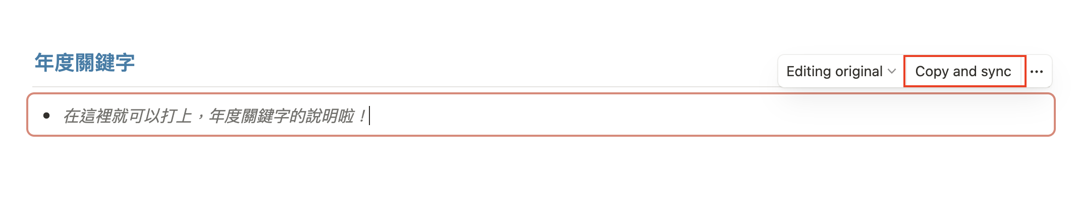 點擊紅框框上面的「Copy and sync」(複製與同步)後,前往要放置的其他頁面,再按下 Ctrl V 就可以將同步區塊貼至另一個頁面啦!