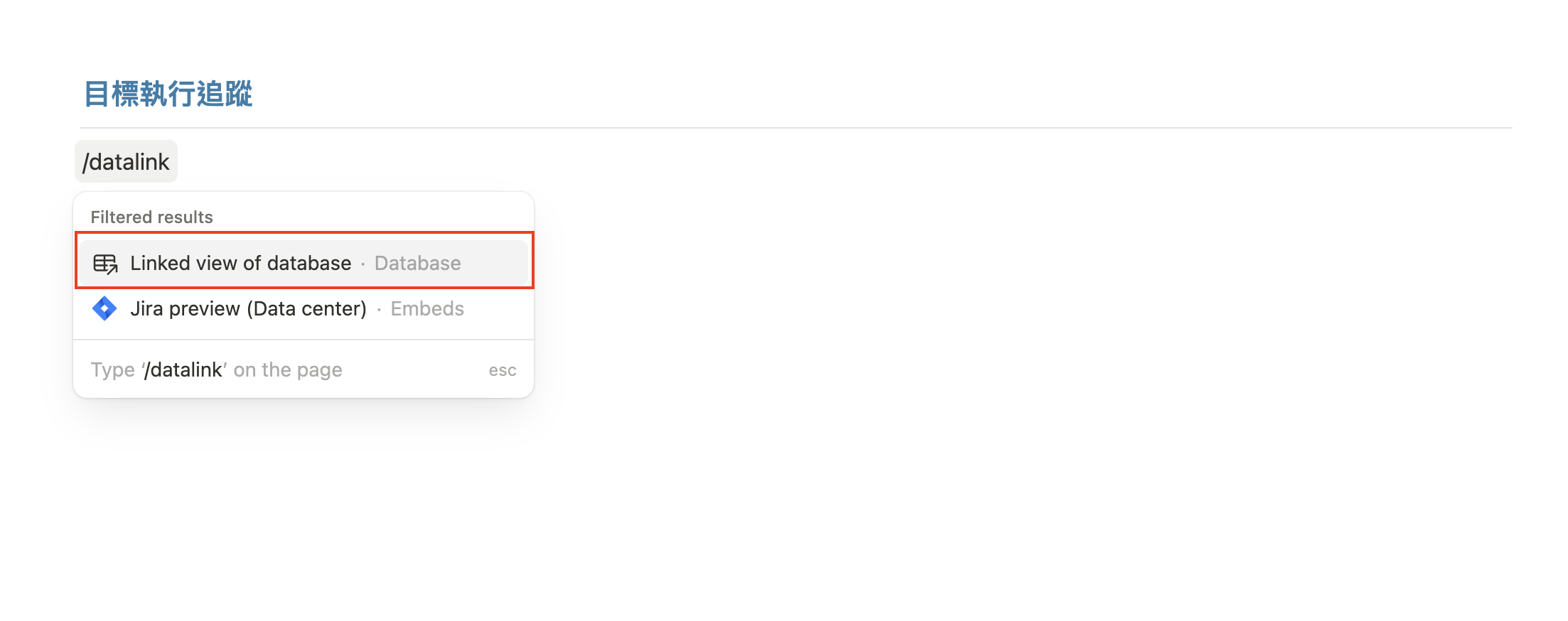 輸入快捷鍵 /datalink,並點選「Linked view of database」(資料庫串連)。