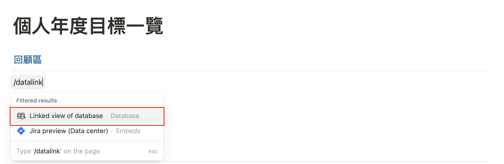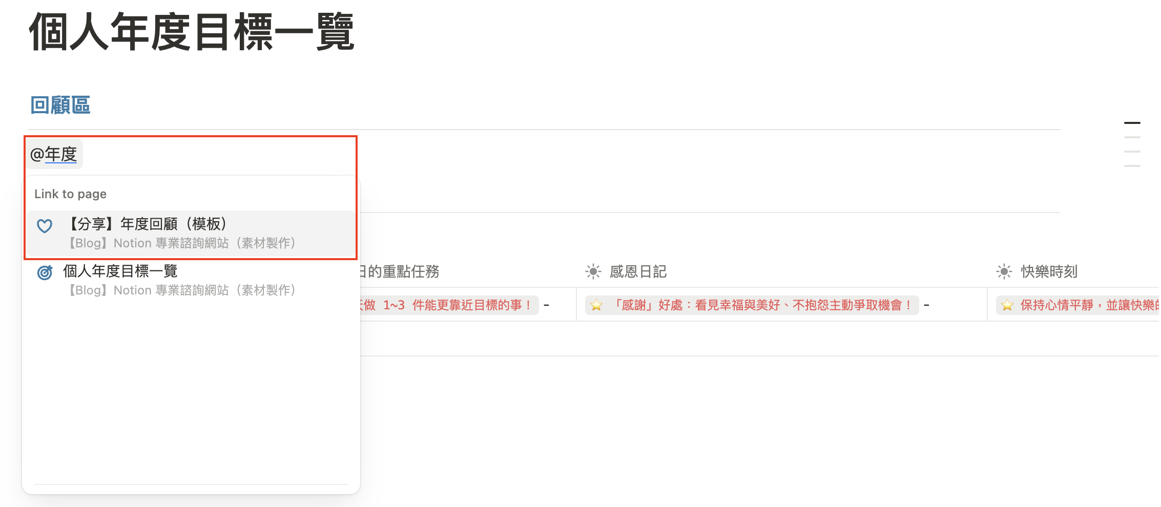 輸入快捷鍵 @,點選「年度回顧」的資料庫。